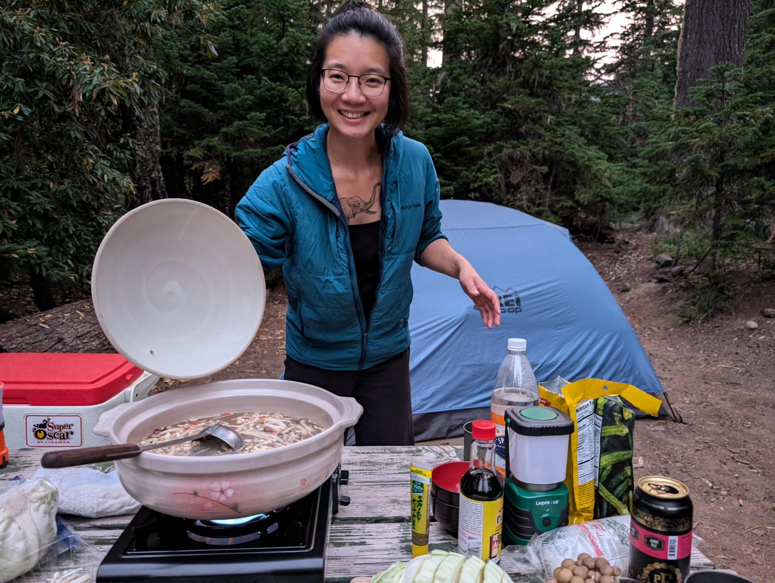 Photo. Zhou, beginner camper camping for the first in years, and enjoying cooking favorite Asian food outdoors.